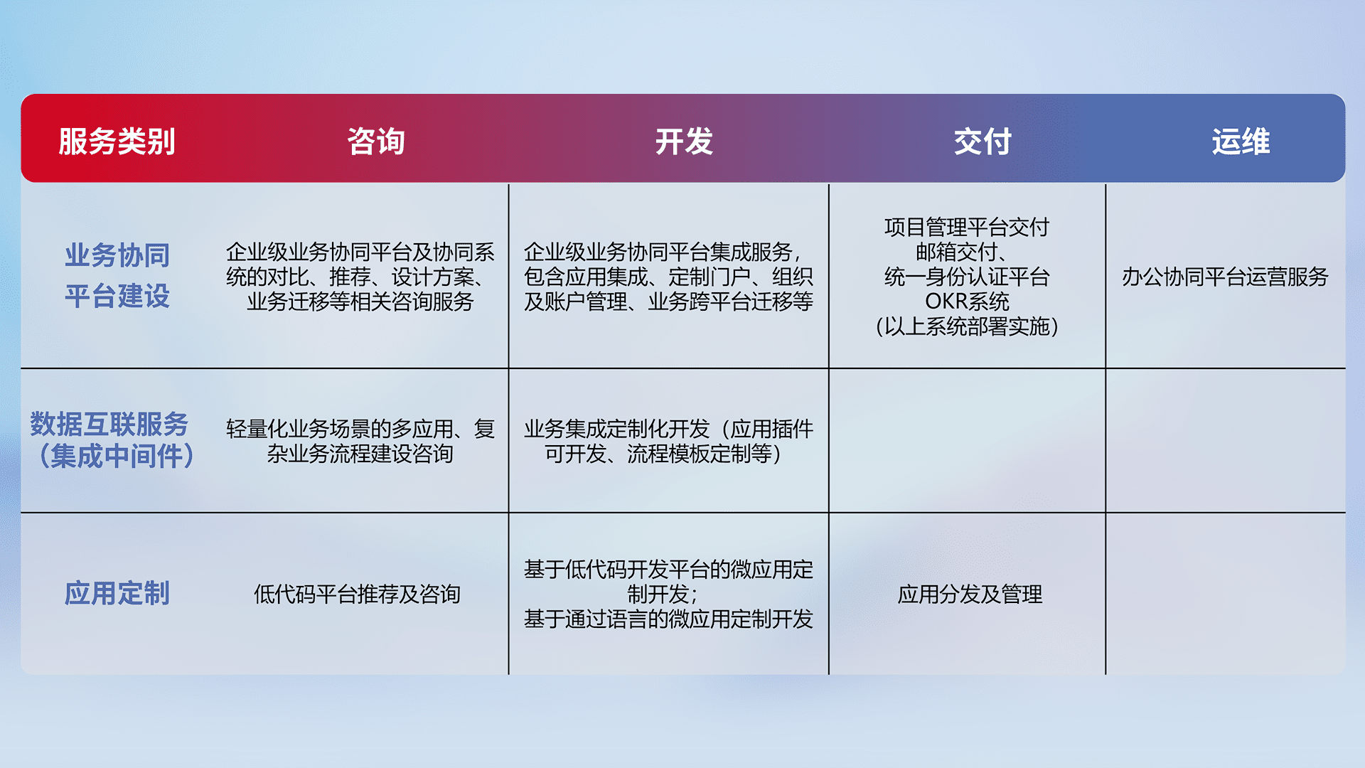 针对钉钉、、、企微、、IDaas等平台级产品提供产品的规划、、、、方案、、交付、、、定制化开发等服务,,,实现如统一协同办公、、智能客户服务、、、混合会议管理、、、智能数据查询、、、、等业务场景,,,实现数字化转型。。